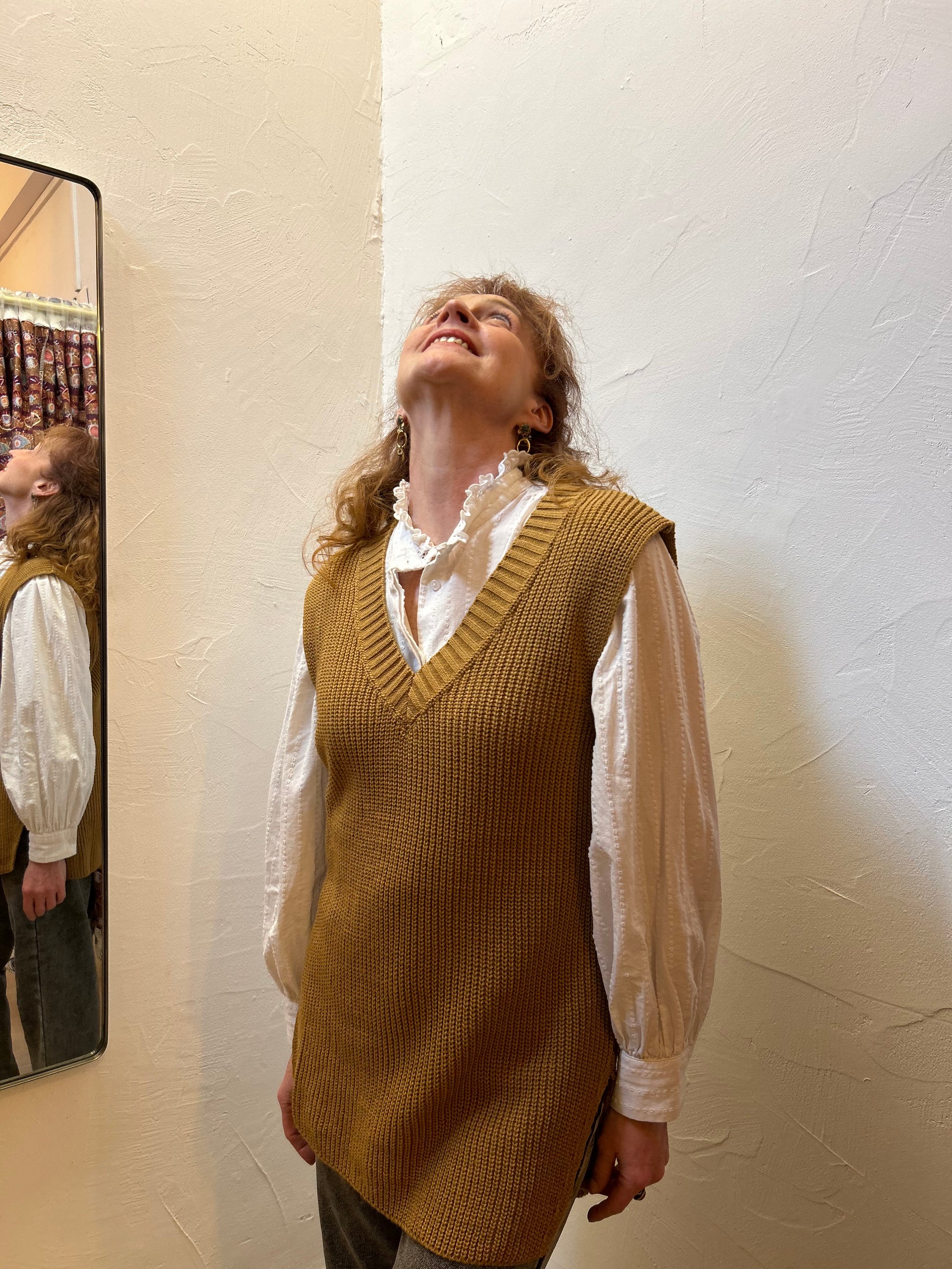 Ce pull long sans manche jaune moutarde se distingue par son motif circulaire graphique et sa coupe fluide. Idéal pour la mi-saison, il se superpose facilement et apporte confort, chaleur et modernité à vos looks urbains.